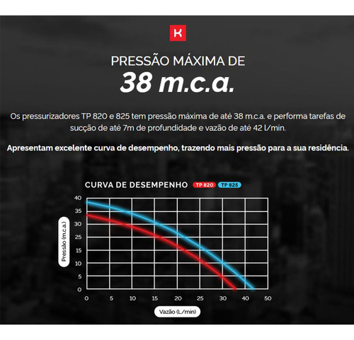 O pressurizador Komeco TP 825 G3 é capaz de fornecer uma pressão de até 38 metros de coluna d’água e uma vazão de até 42 litros por minuto. É indicado para uso residencial e comercial em sistemas de água quente ou fria, e pode ser instalado em qualquer ponto da rede hidráulica.